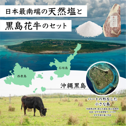 黒島は肉用牛生産が盛んな島で牛の島と呼ばれています。 ただ、子牛の段階で島外へ出荷しているため、黒島で本格的な黒毛和牛を口にする機会は少ない状況です。「牛の島」黒島でこそおいしいお肉を食べてもらいたい想いから「黒島花牛」は誕生しています。 また地下100mから取水する天然海水を使用した「沖縄黒島の塩」は甘みがある塩でお肉との相性がとてもぴったりです。 ぜひセットとしてお楽しみください。