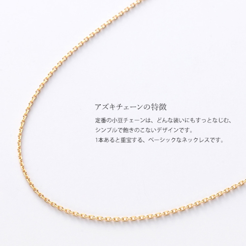 定番の小豆チェーンを使用したネックレス。どんな装いにもすっとなじむ、シンプルで飽きのこないデザインは、日々のコーディネートにさりげない輝きを添えてくれます。