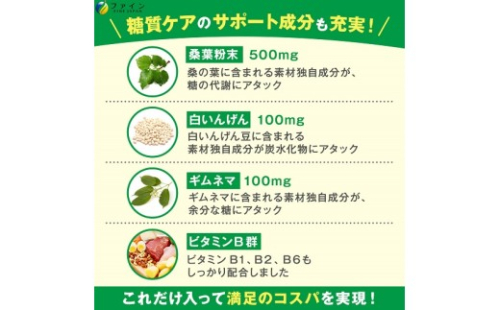 ◇規格成分(3粒あたり):桑葉粉末 500mg、ギムネマシルベスタエキス末 100mg、白インゲン豆抽出物 100mg、サラシアエキス末 20mg、糖抑アミラーゼキラー 20mg