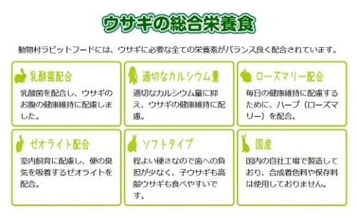 小動物のための専用フード 【動物村】シリーズより。 栄養バランスに優れたチモシー牧草が主原料。高繊維・低たんぱくなので体系が気になるウサギの主食にもおすすめです。 ウサギの健康維持に配慮カルシウムを適切な量に抑え、ハーブを配合。 また、乳酸菌を配合し、お腹の健康維持に配慮。 食べやすいソフトタイプで嗜好性も抜群!成ウサギにおすすめの総合栄養食。 製造者:イースター株式会社