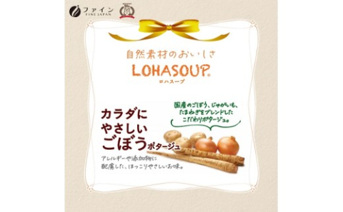 みんなホッと安らぐ美味しいポタージュ♪ 食物アレルギーを持つ方、添加物、動物性原料、産地等、素材にこだわった製品を求める方のための、 カラダの健康をいたわる自然派スープ。 ●3種の国産野菜(ごぼう、じゃがいも、たまねぎ)をブレンドしたほっこりやさしいお味のごぼうポタージュ。 ●鹿児島県産ごぼう皮まるごと使用(※77%使用(ごぼうに占める割合)) ●アレルギー特定原材料等28品目不使用。 ●香料・動物性原料不使用。 【取扱事業者】株式会社ファイン