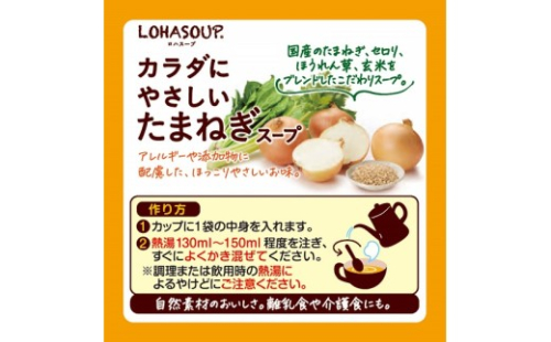 ●3種の国産野菜(たまねぎ、セロリ、ほうれん草)を使用し、玄米をブレンドしたほっこりやさしいお味のたまねぎスープ。