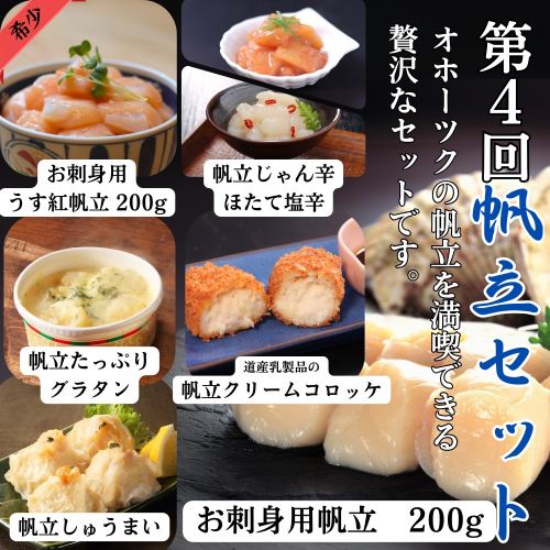 【第四回】帆立玉冷200g、薄紅帆立玉冷200g、帆立グラタン1個、帆立しゅうまい4個入、帆立クリームコロッケ3個入、帆立じゃん辛200g、帆立塩辛200g