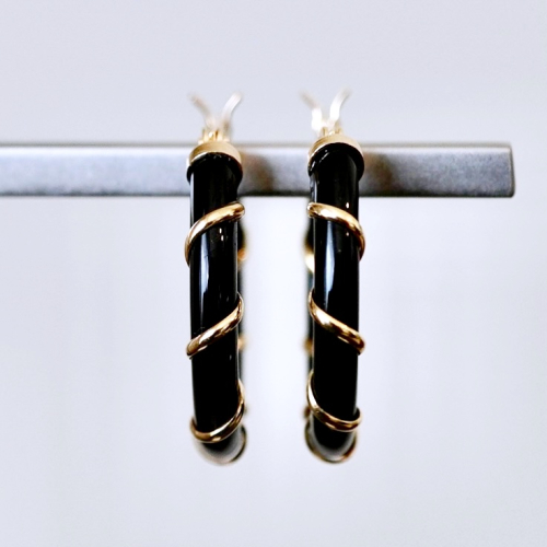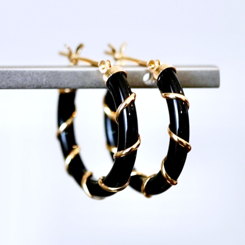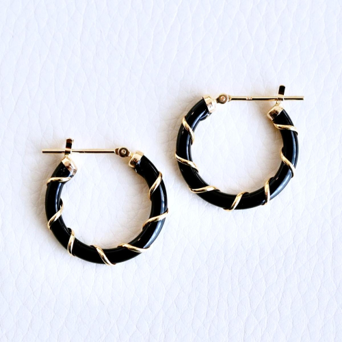 【商品詳細】 ブラックがクールなオニキスのフープピアスです。 ゴールドがスパイラル状に巻き付けられていてデザインのアクセントになっています。 20mmのボリューム感とスタイリッシュな印象で耳元を演出してくれます。 ケースに入れ、リボンをかけてお届けいたします。 【素材】 K18(18金) イエローゴールド オニキス