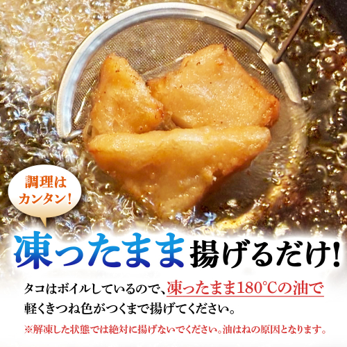 タコはボイルしているので、凍ったまま180℃の油で軽くきつね色がつくまで揚げてください。