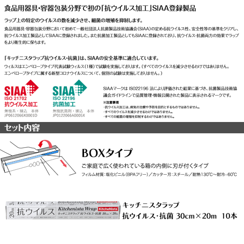- 日本初の「抗ウイルス仕様ラップ」 SIAA登録製品 キッチニスタラップ 抗ウイルス・抗菌 30cm×20m 10本 ラップ 食品ラップ キッチン 台所用品 日用品 抗ウイルス 抗菌 キッチニスタ 消耗品 キッチン用品 [DO012ci]