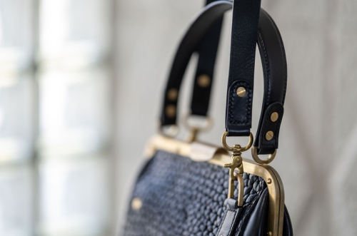 また口金は、革のエイジングの魅力を最大限に引き出すため、空気や人の手に触れることによる経年変化で、様々な表情が楽しめる真鍮製に。創業明治35年かんざし職人だった創業者から5代目まで技術を引き継いでいる職人と共に製作。真鍮板の切断、曲げ、そしてロウ付けまで一つ一つの工程が丁寧な手仕事で行われています。個性豊かな革、飴色に変化する真鍮、共に人生を送る人。全てのエイジングを存分に楽しめるバッグです。