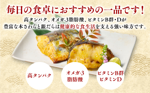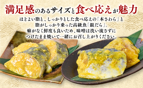 ふっくら美味しい「本さわら」と、脂がしっかり乗った高級魚「銀だら」の味噌漬けを約1kg(味噌含む)お届けします。
