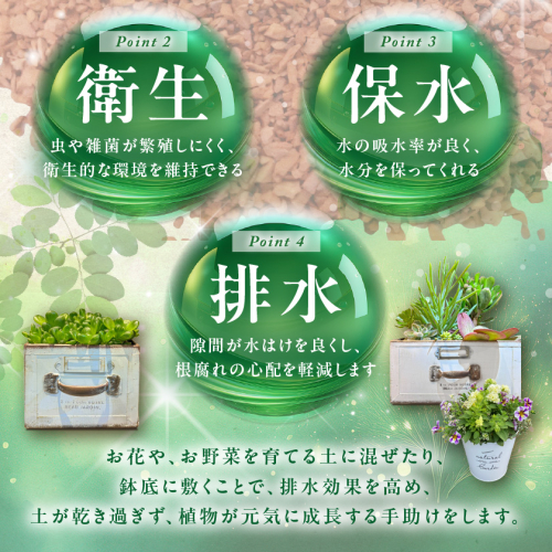 お花や、お野菜を育てる土に混ぜたり、鉢底に敷くことで、排水効果を高め、土が乾き過ぎず、植物が元気に成長する手助けをします。