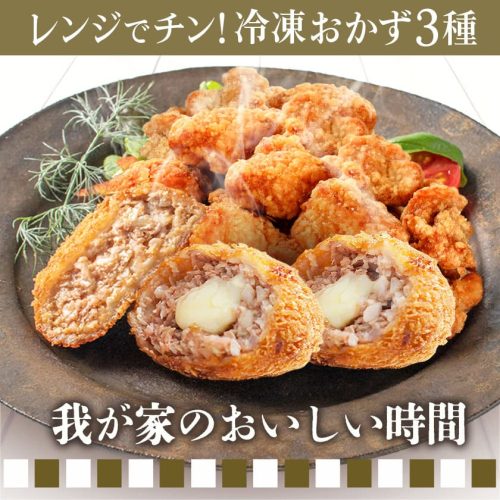 お手軽簡単レンジで温めるだけの冷凍おかず3種をセットでお届けします♪ ◆メンチカツ&チーズメンチカツ◆ 都城産の豚肉「観音池ポーク」を使用したメンチカツ! コンセプトは「おふくろの味」ご家庭で作るような馴染みのある味付けに仕上げました。 食べたときに口いっぱいに広がる旨味と甘み、ジューシーな肉汁、ふんわりとした食感をお楽しみいただけます。 シンプルでお肉の味わいが際立つプレーンと、お子様も喜ぶチーズ入りメンチカツの2種をお届けします。 1個づつ袋に入っているので、食べたい分だけ使用できるのでお弁当やおかずなどに便利です。 ◆唐揚げ◆ 国産鶏のむね肉を使った唐揚げはあっさりとした味わいです。 お弁当のおかずや、レモンを絞ってさっぱりおつまみにもどうぞ♪