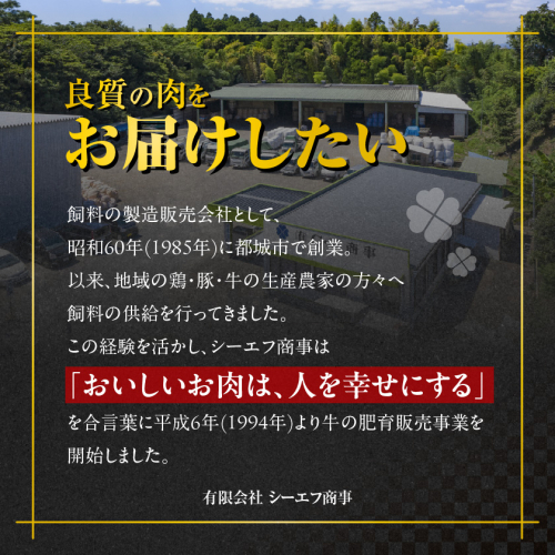 宮崎牛とは、宮崎県内で生産肥育された黒毛和種のうち日本食肉格付協会の格付において肉質等級4等級以上の牛肉です。 柔らかさと繊細な旨みは、日本一の名に相応しい味わいです。 柔らかさと歯ごたえのバランスと、全体的に霜降りが入りやすくジューシーで食べ応えのある宮崎牛ロースをステーキ用でお届けします。 カットした時に出た肉汁は、焼いた後のフライパンに入れ、旨味たっぷりの肉汁と脂を使ってステーキソースを作るのもおすすめです。 この機会に「宮崎牛ロースステーキ」の旨味を存分にご堪能ください。 ~解凍方法~ 調理の前日に冷凍庫から冷蔵庫へ移動させて、調理の15~30分前には冷蔵庫から取り出して常温で保管してください。※夏場はご注意ください。 お急ぎの場合は、容器に密封した食材を入れ、水を流しながら解凍してください。※お湯の使用はお控えください 解凍した際にドリップ(肉汁)が出た場合は、キッチンペーパーなどで拭き取ってください。焦げ付き防止になります。 ◆シーエフ商事について 飼料の製造販売会社として、昭和60年(1985年)に都城市で創業。以来、地域の鶏・豚・牛の生産農家の方々へ飼料の供給を行ってきました。 この経験を活かし、シーエフ商事においても、良質の肉をお届けしたいと、「おいしいお肉は、人を幸せにする」を合言葉に平成6年(1994年)より牛の肥育販売事業を開始しました。