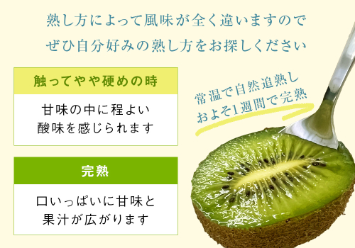 同じキウイでも熟し方によって風味が全く違いますので、ぜひ自分好みの熟し方をお探しください。
