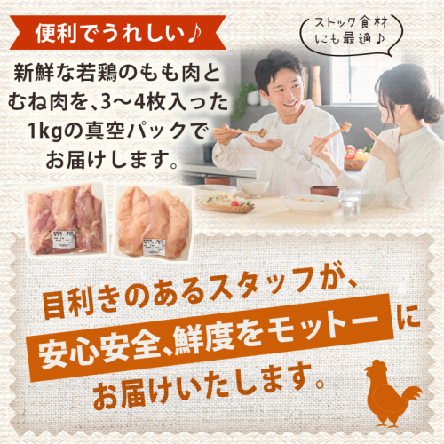 宮崎県産若鶏の人気部位を目利きのあるスタッフが、安心安全、鮮度をモットーにお届けいたします! 新鮮な若鶏のもも肉とむね肉を、1パックに3~4枚入った、1kgの真空パックでお届けします。 ボリュームのある1枚のままでも♪お好きなサイズにカットしても♪様々な料理で活躍します!! ◆もも肉は程よく脂がのりジューシーな味わいで、定番の唐揚げ、チキン南蛮、チキンカツ、てりやきチキン、カレー等の料理に最適です。 ◆むね肉は高たんぱく、低カロリーな部位で、サラダチキンや棒棒鶏など様々な料理に最適です。安心安全な飼料で育てられており、たんぱく質やビタミンを多く含有しています。 ※解凍方法:肉を調理する前日に冷凍庫から冷蔵庫へ移して下さい。 調理する15~30分前には冷蔵庫から出して室温に戻して下さい。(肉汁とともに旨味を逃がすことなく、ジューシーに仕上がります。)