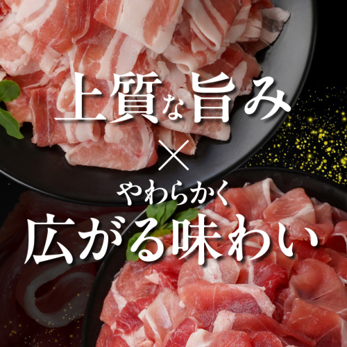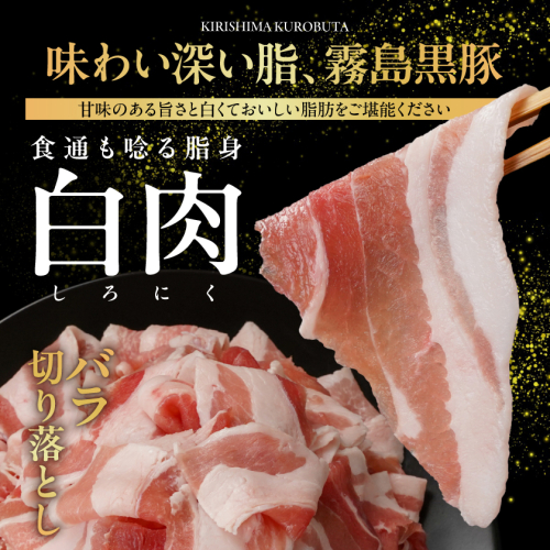 霧島黒豚の特長である脂身「白肉」を含むバラ肉と、歯切れが良く赤身の多いもも肉の切り落としをセットでお届けします。