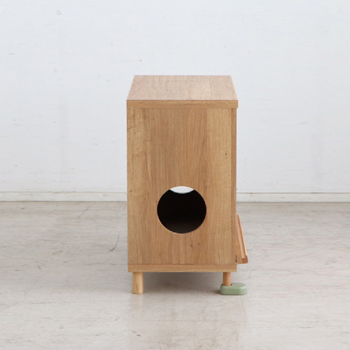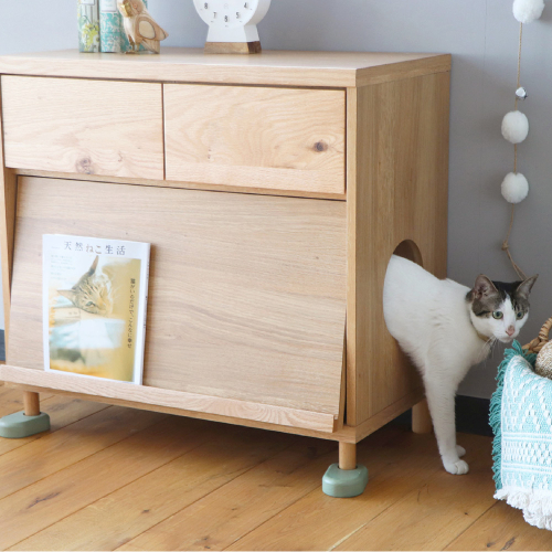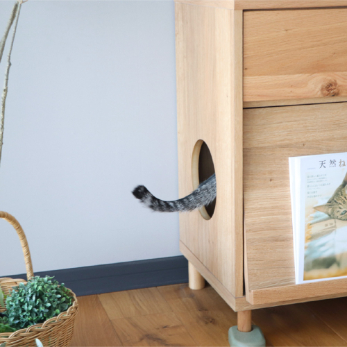 側面に穴が空いているので、狭くて暗い場所が好きな猫ちゃんが中に入れます。下部のスペースにはトイレを設置でき、匂い防止や景観を保ちつつ利用できる便利な仕様です。前板はマガジンラックになっているので普段使いもできます!