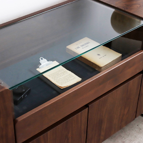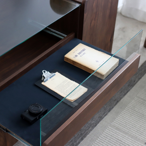 最大の特徴は、天板に設けられたガラスケースです。お気に入りのアクセサリーや時計、香水などを飾れば、まるでショップのショーケースのように、あなただけの特別な空間を演出できます。