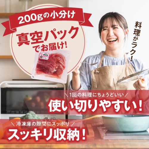 宮崎県のブランドポーク「霧島黒豚」は、黒豚専用飼料を給餌し、黒豚特有の「甘味のある旨さ」が特長の豚肉です。 「霧島黒豚」の中でも歯切れが良く赤身の多いモモ肉を、切り落としにスライスしました。必要な時に必要な分だけ調理できる200gずつの小分け真空パックをご用意しました。さっと炒めるだけの料理から時間をかけてじっくり煮込む料理まで、幅広いメニューに活躍します。和洋中問わず、様々な料理のメイン食材として重宝します。 上質な旨味とコク、程よい噛みごたえ!後味は想像以上にさっぱりしており、その上品な味わいは食べる人を魅了します。 ※一度解けたものを再び凍らせますと、味、品質、鮮度が落ちますのでご注意ください。 ※生肉は中心部まで、十分に加熱してお召し上がりください。