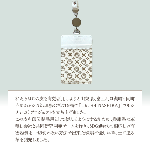 「URUSHINASHIKA」(うるしなしか)は「漆」+「山梨」+「鹿」から出来た、山梨県が商標登録したブランドです。 「甲州印伝」はシカ革の上に漆で紋様を付ける山梨県を代表する伝統工芸品の一つですが、その革は中国から輸入されたキョンの革が使われています。 一方山梨県内では野生のニホンジカによる農作物への被害が深刻化していてその対策として一定数を捕獲していますが、その皮の殆どは廃棄されています。 私たちはこの皮を有効活用しようと山梨県、富士河口湖町と同町内にあるシカ処理場の協力を得て「URUSHINASHIKA」(ウルシナシカ)プロジェクトを立ち上げました。 この皮を印伝製品用として使えるようにするために、兵庫県の革鞣し会社と共同研究開発チームを作り、SDGs時代に相応しい有害物質を一切使わない方法で出来た環境に優しい革、土に還る革を開発しました。 印伝加工(漆付け)は「甲州印伝 伝統工芸士」の資格を持つプロが担っています。 これまでの甲州印伝には無い『白いシカ革』の肌に優しい風合いをお楽しみください。 【原産地】 山梨県 【原材料】 富士河口湖町で捕獲されたニホンジカの皮