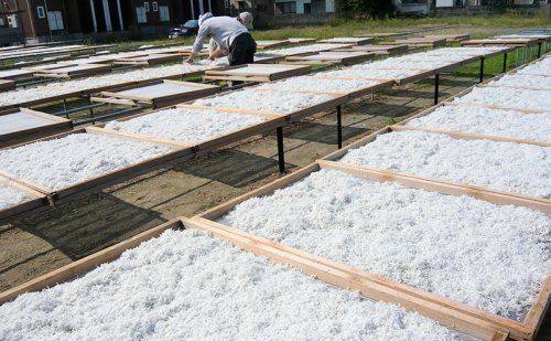 浜松市舞阪港で水揚げされた鮮度のよいしらすを厳選し、すぐに加工場にて茹であげ、天日干しにします。