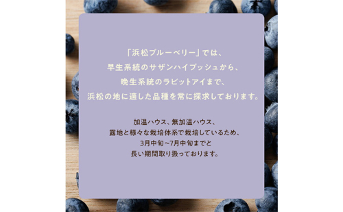 「浜松ブルーベリー」では、早生系統のサザンハイブッシュから、晩生系統のラビットアイまで、浜松の地に適した品種を常に探求しております。
