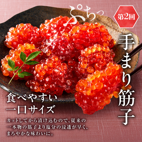 カットしてから漬け込むので、従来の一本物の筋子より塩分の浸透が早く、少ない塩分でも均等に行き渡り、まろやかな味わいに。
