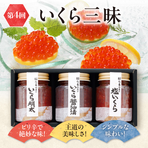 『人気の醤油味』、『ピリリと唐辛子の辛みが効いた明太味』、『いくら本来のコクを味わえる塩いくら』の3種の味をお楽しみください。
