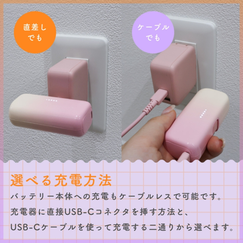充電器に直接USB-Cコネクタを挿す方法と、付属のUSB-Cケーブルを使って充電する2通りから選べます。