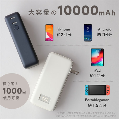 iPhone・スマートフォンを約2~3回、iPad約1回分充電できる10000mAhのバッテリー容量です。