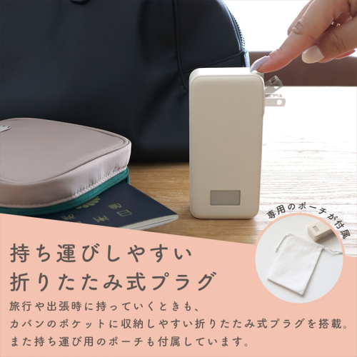 旅行や出張時に持っていくときも、カバンのポケットに収納しやすい折りたたみ式プラグを搭載。また持ち運び用のポーチも付属しています。