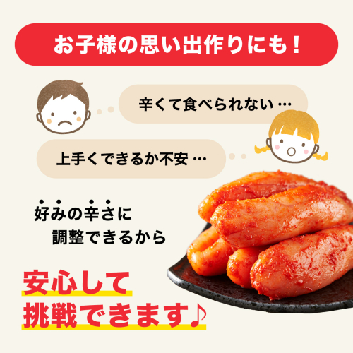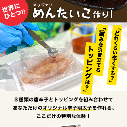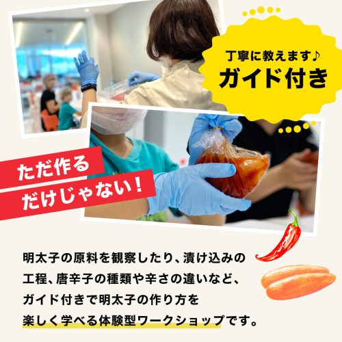 ただ作るだけではなく、明太子の原料を観察したりや漬け込みの工程、唐辛子の種類や辛さの違いなど、ガイド付きで明太子の作り方を楽しく学べる体験型ワークショップです。