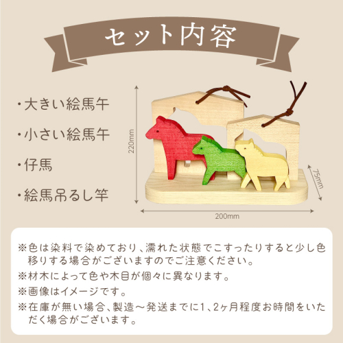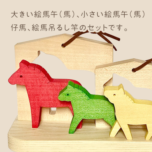 大きい絵馬午(馬)、小さい絵馬午(馬)、仔馬、絵馬吊るし竿のセットです。