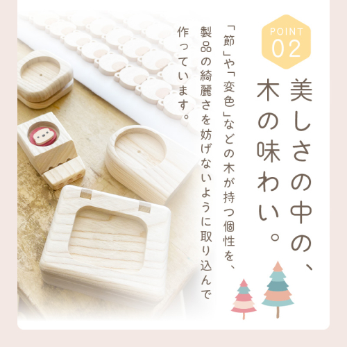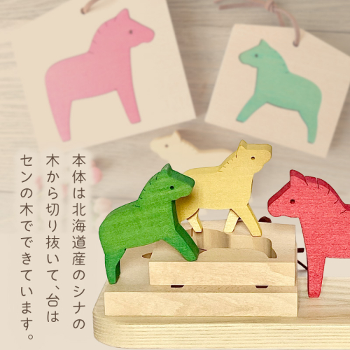 本体は北海道産のシナの木から切り抜いて、台はセンの木でできています。