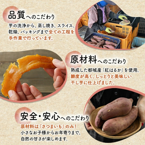 原料は「さつまいも」のみ。素材を活かした干し芋だから、お砂糖、調味料、着色料、保存料を一切使用していません。お子様からお年寄りまでみんなに安心して食べて欲しいからこそのこだわりです。自然本来の甘さを是非ご堪能ください。