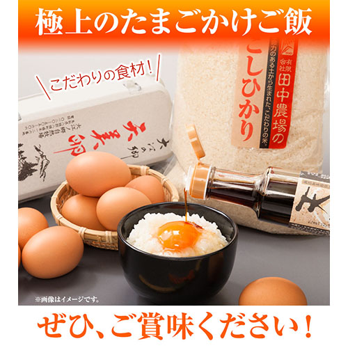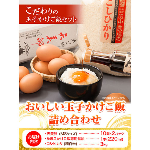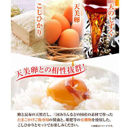 内容量:・天美卵10個入り×2パック(MSサイズ)・コシヒカリ精白米3kg・たまごかけご飯専用醤油天のしずく220ml
