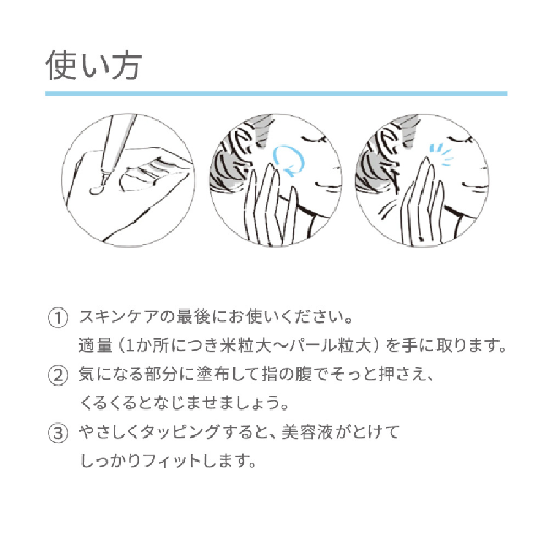 使い方は、スキンケアの最後に、気になる部分に米粒大からパール粒大の量を塗布し、指の腹でやさしくなじませます。その後、軽くタッピングすることで、美容液が肌にしっかりフィットします。無香料、無着色、パラベンフリーで、アレルギーテストおよびパッチテスト済みです。