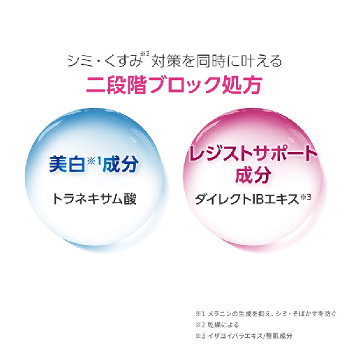 この製品は、シミや乾燥によるくすみをケアする独自の「二段階ブロック処方」を採用しています。また、「セイヨウナシ果汁発酵液」を整肌成分として新たに配合し、肌のリズムにアプローチすることで、明るい肌印象へと導きます。