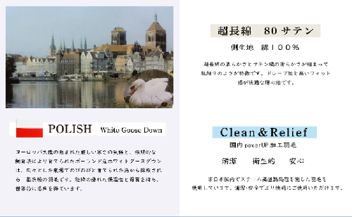 - サイズ:150×210cm 重量:1.3kg 側生地:綿100%(超長綿80サテン) 中身:ポーランド産ロイヤルホワイトグース93%(ダウンパワー400dp以上) 2層式キルト仕立て 日本製