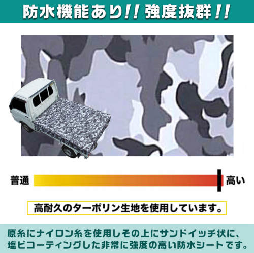 \\南榮工業の迷彩トラックシートが登場!// 防水性があり強度抜群!軽くて使いやすい軽トラック用シートです。 荷物を紫外線や悪天候から守り、落下を防ぎます。 しっかりと固定できるゴムバンド付きで、すぐに使用できます。 シートには、断熱・保冷機能があり、耐久性の高いターポリン生地を使用しております。