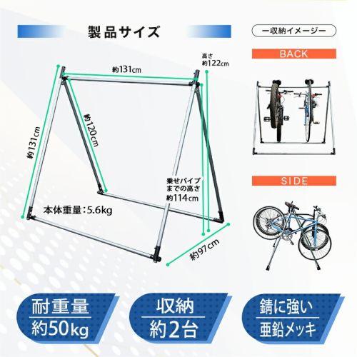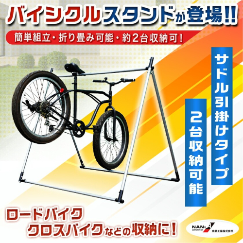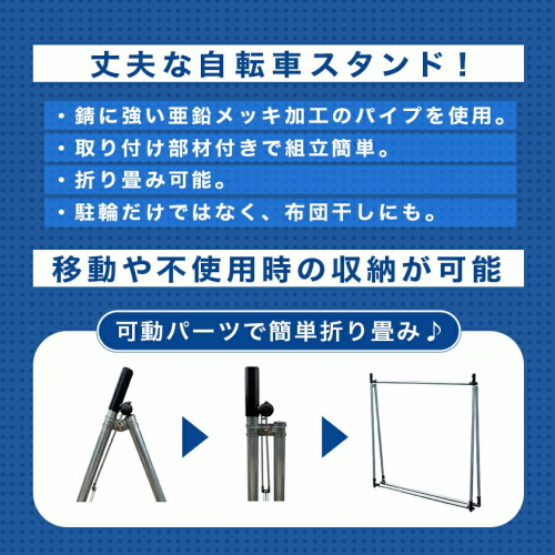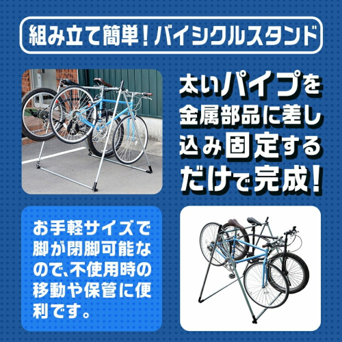 \\南榮工業の自転車スタンドが登場// ロードバイクやクロスバイク等のサドル引掛けタイプの自転車スタンドです。 太いパイプを金属部品に差し込み、固定するだけの簡単組立で丈夫な仕上がり! 折り畳みが可能なお手軽サイズなので、移動や不使用時の収納が可能です。 駐輪だけではなく、布団干しにも便利です。 錆に強いパイプを使用しておりますので、長くお使いいただけます。 ◇−特徴−◇ ・錆に強い亜鉛メッキ加工のパイプを使用。 ・取り付け部材付きで組立簡単。 ・折り畳み可能。 ※組立には工具等が必要です。セットには含まれませんので、ご自身でご準備ください。 (スケール・マジック・プライヤー・ドライバー・ゴムハンマー・軍手)