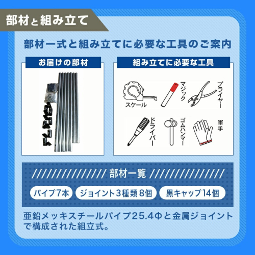 太いパイプを金属部品に差し込み、固定するだけの簡単組立で丈夫な仕上がり!