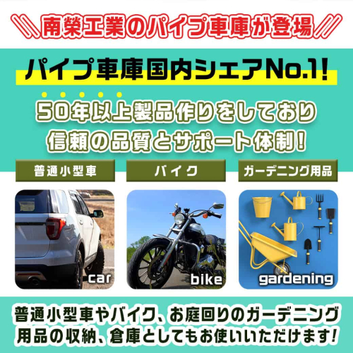 パイプ車庫国内シェアNo.1!50年以上製品作りをしており信頼の品質とサポート体制です。