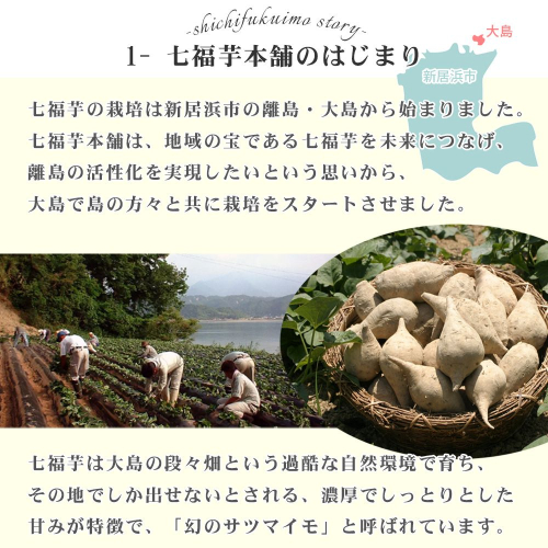 「七福芋」は、愛媛県新居浜市沖に浮かぶ離島・新居大島で誕生した、希少なさつまいもです。地元では古くから「白いも」と呼ばれて愛されてきました。