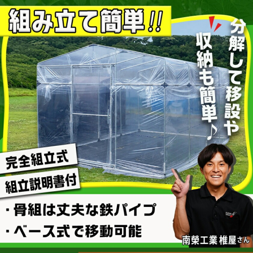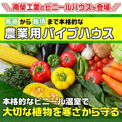 \\南榮工業のビニールハウスが登場// 育苗から栽培まで、本格的な農業用パイプハウスです。 冬の温度管理や夏の雨よけにも役立ち、害虫や病気から大切な作物を守ります。 ベース式なので移動しやすく、連作障害対策にピッタリ! 自社国内工場生産で強度・耐久性に優れ、安心して長期に渡りお使いいただけます。 ◇−特徴−◇ ・本格的なビニール温室 ・完全組立式で簡単設置 ・一枚扉スライド式 ・骨組は丈夫な鉄パイプを使用 ・ベース式で移動可能 ・分解して移設や収納も簡単 ※組立には工具が必要です。セットには含まれませんので、ご自身でご準備ください。 ・メジャー(寸法測定用) ・カッター(ビニールカット) ・プライヤー(部品取り付け) ・プラスドライバー(部品取り付け) ・ハンマー(部品取り付け) ・マジック(パイプ印付け用) ・軍手 ※強風時はビニールを外してください。