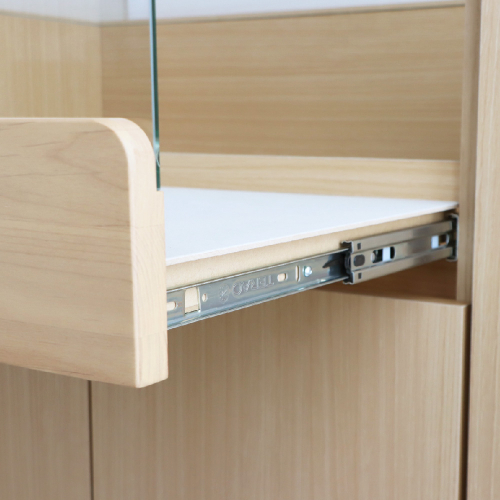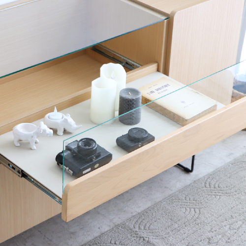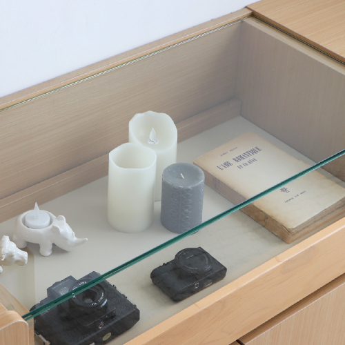 最大の特徴は、天板に設けられたガラスケースです。お気に入りのアクセサリーや時計、香水などを飾れば、まるでショップのショーケースのように、あなただけの特別な空間を演出できます。