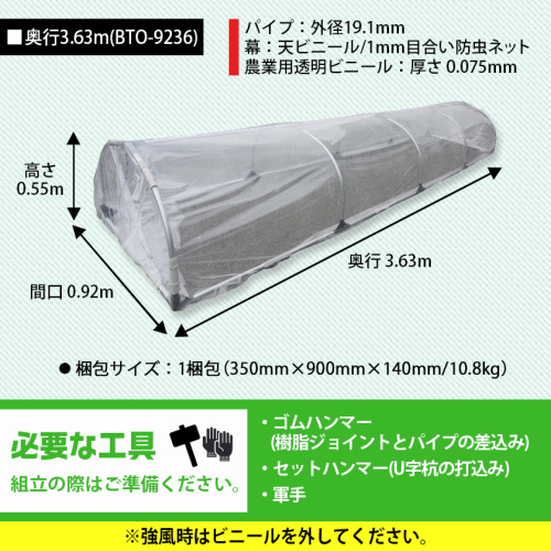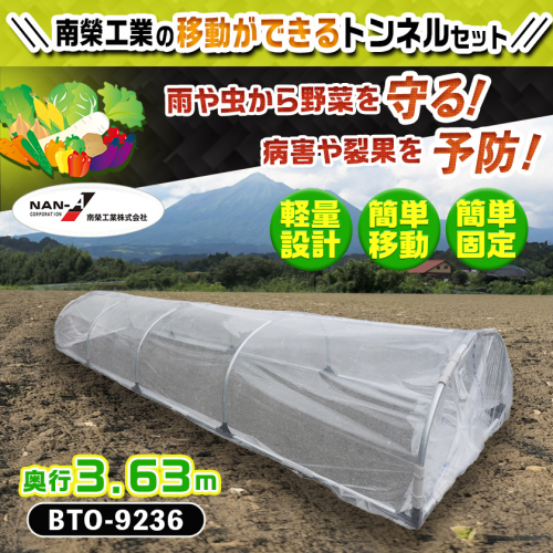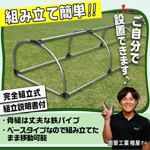 \\南榮工業の「移動ができる!」トンネルセット// 軽量設計で移動も固定も簡単!野菜に合わせて、季節に合わせて、かぶせるだけの移動式トンネルセットです。 雨や虫から野菜を守り、病害や裂果を予防します。 移動式トンネルセットで美しくみずみずしい野菜を育ててください。 ◇−特徴−◇ ・骨組は丈夫な鉄パイプを使用 ・ベースタイプなので組み立てたまま移動可能 ・耐候性と耐久性に優れた農業用ビニール使用 ・防虫対策の1mm目合いの防虫ネット付き ・移動設置が簡単なので連作障害対策しやすい ※組立には工具等が必要です。セットには含まれませんので、ご自身でご準備ください。 ・ゴムハンマー(樹脂ジョイントとパイプの差込み) ・セットハンマー(U字杭の打込み) ・軍手 ※強風時はビニールを外してください。