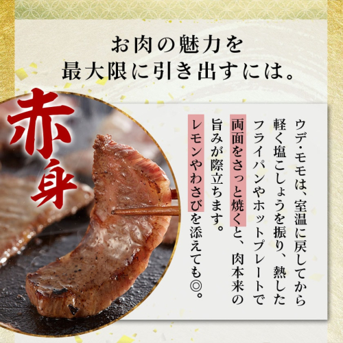 赤身の風味豊かなウデ肉とモモ肉、口の中でとろける霜降りのバラ肉を各200gずつセットにしてお届けします。
