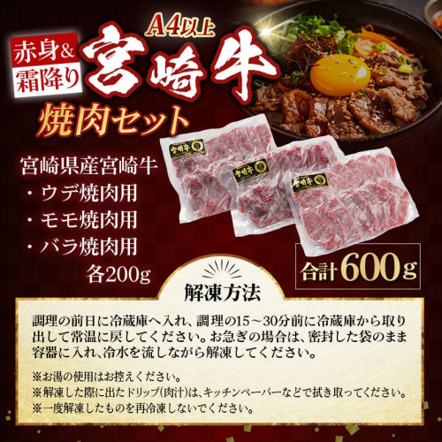 宮崎県が誇るブランド肉「宮崎牛」は、きめ細やかな霜降りと豊かな旨味が特長の肉質等級A4以上の黒毛和牛です。 赤身の風味豊かなウデ肉とモモ肉、口の中でとろける霜降りのバラ肉を各200gずつセットにしてお届けします。 赤身肉は、室温に戻してから軽く塩こしょうを振り、熱したフライパンやホットプレートで両面をさっと焼くと、肉本来の旨みが際立ちます。お好みでレモンやわさびを添えてもさっぱりと楽しめます。 バラ肉は、霜降りの脂の甘みが魅力です。少し強めの火力で表面をカリッと焼き、肉汁を閉じ込めてください。余分な脂はキッチンペーパーで拭き取ると、さらに食べやすくなります。シンプルに焼肉のタレや塩だけでも絶品です。 お肉の魅力を最大限に引き出すため、和牛を知り尽くした職人が、部位ごとに最適な厚みと形にカット。切り方で変わる部位ごとの食感と風味の違いをお楽しみください。部位毎の小分けパックなので、食べたい分だけ解凍できます。 赤身と霜降りを味わえる宮崎牛で、贅沢な焼肉をお楽しみいただけます。 【解凍方法】 調理の前日に冷蔵庫へ入れ、調理の15~30分前に冷蔵庫から取り出して常温に戻してください。 お急ぎの場合は、密封した袋のまま容器に入れ、冷水を流しながら解凍してください。※お湯の使用はお控えください。 解凍した際に出たドリップ(肉汁)は、キッチンペーパーなどで拭き取ってください。 ※一度解凍したものを再冷凍しないでください。