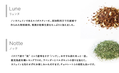 イタリア語で”夜” という意味をさす「ノッテ」。おやすみ前にほっと一息。鹿児島産有機レモングラスに、ラベンダーとベルガモットの香りを加えて。カフェインも気にせずにお楽しみいただけます。チョコレートとの相性も良いです。
