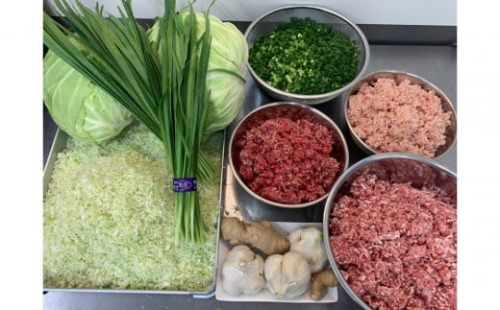 (餡)キャベツ・豚肉・鳥肉・牛肉・ニラ・生姜・ニンニク・アミノ酸・鶏ダシ・塩・コショウ・サラダ油・ごま油・すりごま・醤油・砂糖・酒