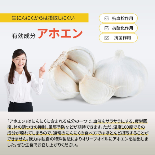 ■注目の有効成分のアホエンをエキストラバージンオリーブオイルに閉じ込めたにんにくオイルです
